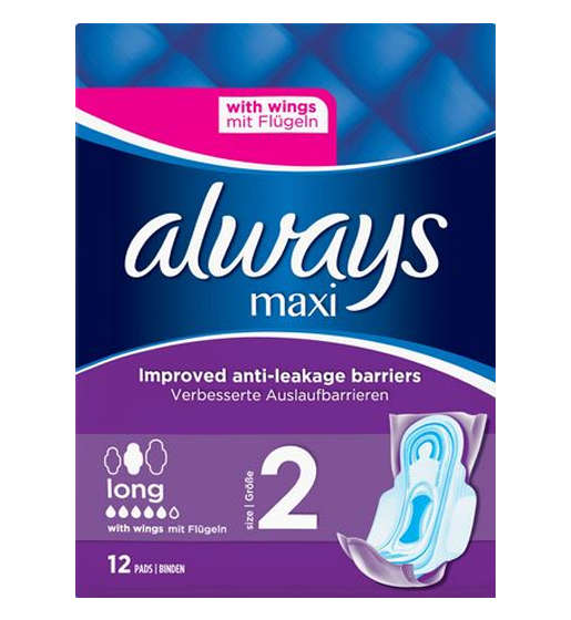 Always Maxi Long is a thick sanitary towel with improved anti-leakage barriers (vs. previous product) and an extra absorbent core in the centre (core+ technology).