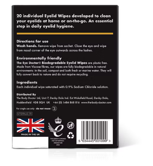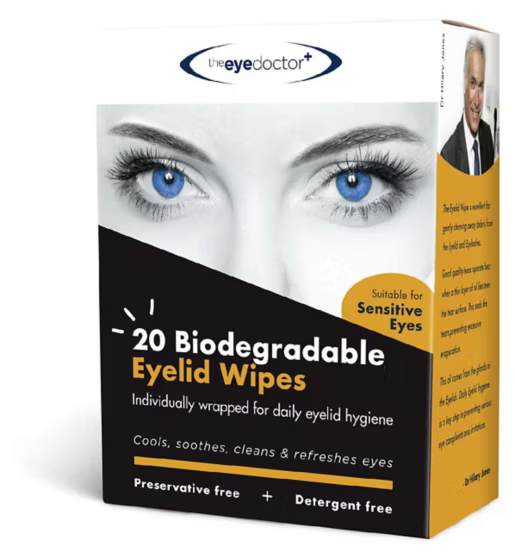 ‘The Eyelid Wipe is excellent for gently cleaning away debris from the eyelid and eyelashes. Good quality tears operate best when a thin layer of oil lies over the tear surface. This seals the tears preventing excessive evaporation. This oil comes from the glands in the eyelids. Daily eyelid hygiene is a key step in preventing various eye complaints and irritations.’ – Dr Hilary Jones, GP & Medical Broadcaster.
