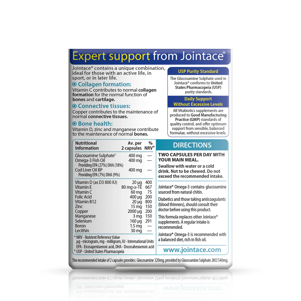 Jointace Omega-3 contains glucosamine sourced from natural chitin. Diabetics and those taking anti-coagulants (blood thinners) should consult their doctor before using this product. This formula replaces other Jointace supplements. A regular intake is recommended. Jointace Omega-3 is recommended with a balanced diet, rich in fish oil.Â